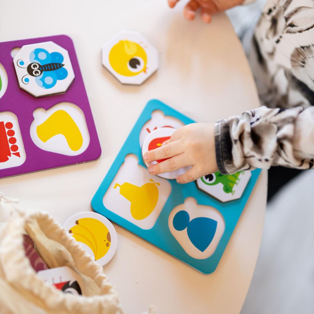 Palat piilosilla -pelissä harjoitellaan värejä, muotoja ja päättelyä yhdistämällä pussissa piilottelevat erimuotoiset palaset pelilaudoille. Sujauttakaa vuorotellen kätenne pussiin ja kokeilkaa, löytyykö omaan pelilautaan kuuluva pala. Iloisesti ja selkeästi kuvitetuilla kuvapaloilla voi leikkiä myös omia lajitteluleikkejä.