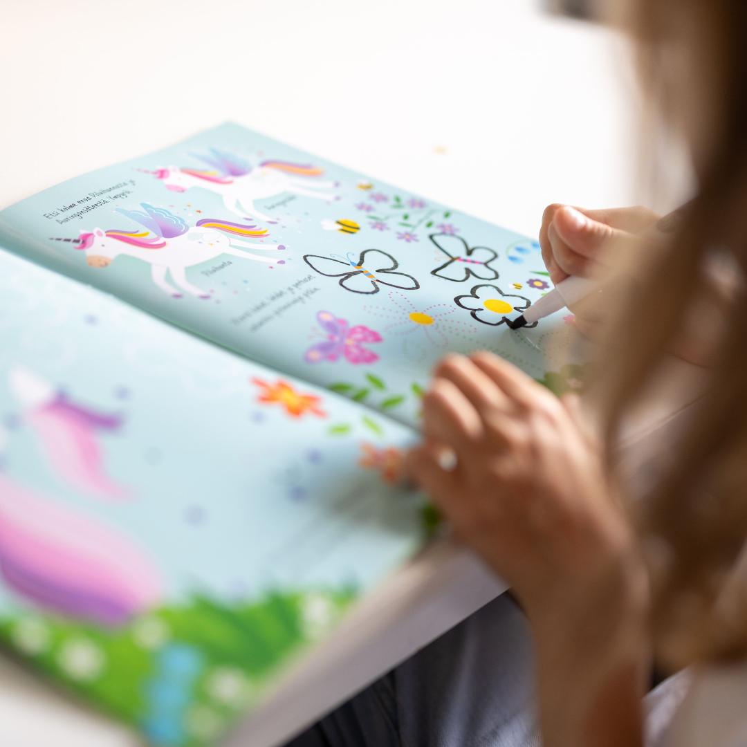 Pyyhittävät Yksisarviset -puuhakirjassa seikkaillaan yksisarvisten lumotussa maailmassa. Hauskoissa tehtävissä etsitään eroja, ratkotaan sokkeloita, täydennetään kuvia ja yhdistetään numeroita. Puuhailun lomassa opitaan käden ja silmän yhteistyötä, keskittymistä sekä lukuja ja logiikkaa. Puuhakirjassa riittää tekemistä pidemmäksi aikaa, sillä se on uudelleenkäytettävä. Kirjan mukana tulee siihen sopiva pyyhittävä tussi.