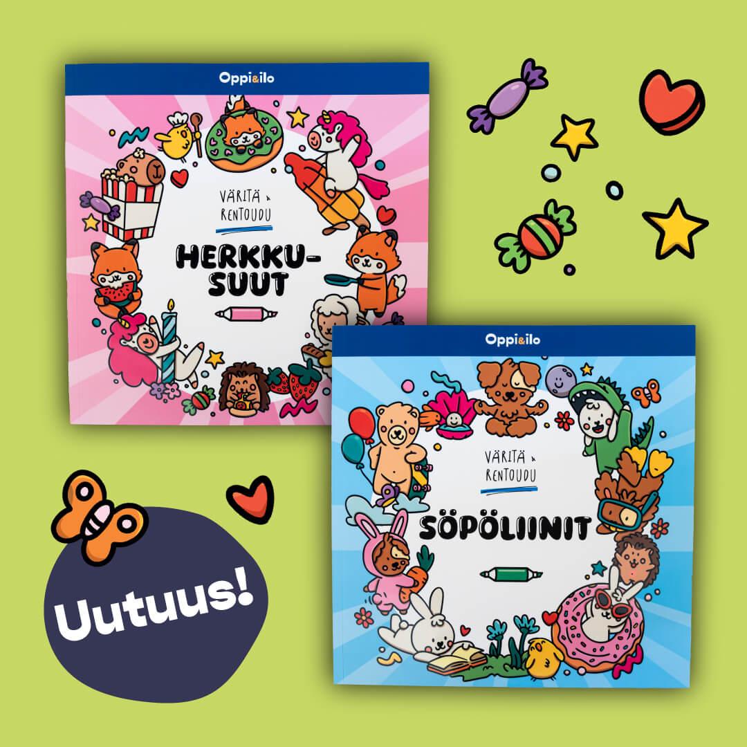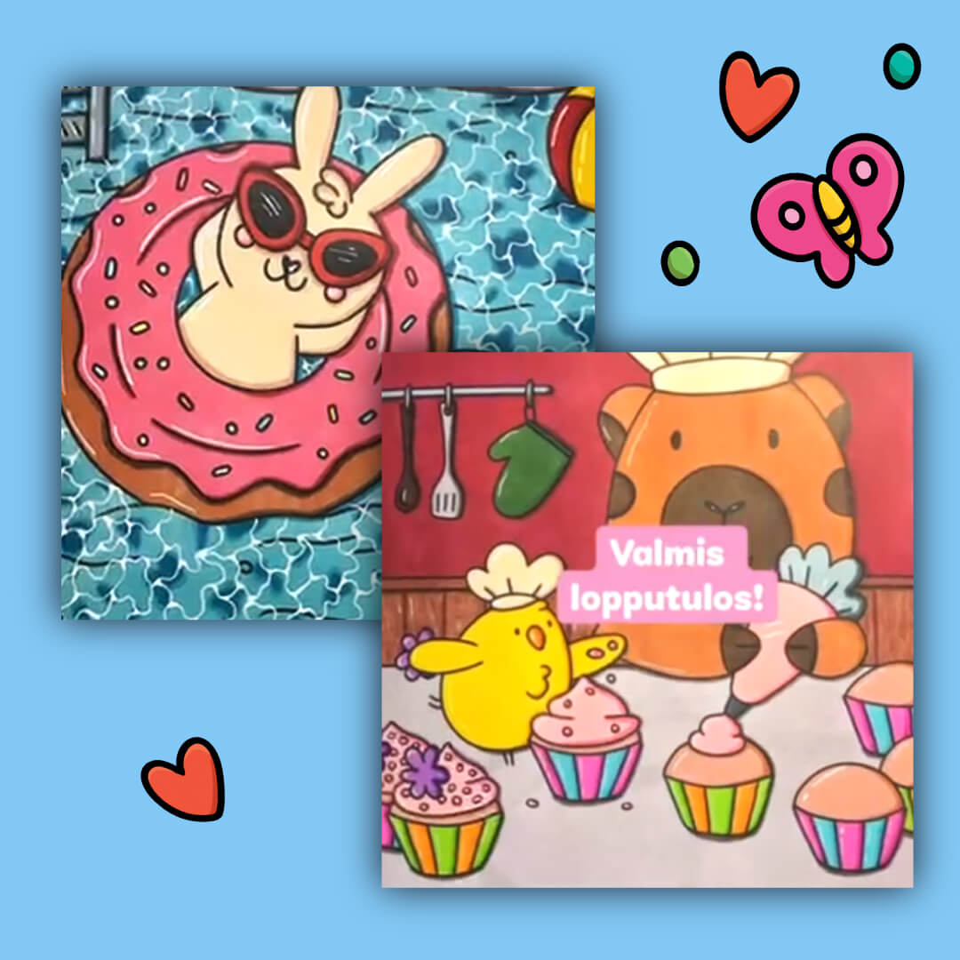 Ihanan söpöt hahmot heräävät henkiin värityskirjojen sivuilla. Värityskirjat sopivat täydellisesti rentouttavaan värityspuuhaan. Kirjat ovat saaneet inspiraationsa luovan värittämisen, cozy coloring -trendistä. Värittäminen rauhoittaa, vahvistaa keskittymiskykyä ja antaa tilaa mielikuvitukselle sekä luovuudelle.